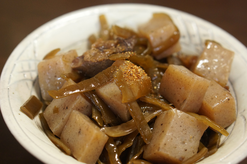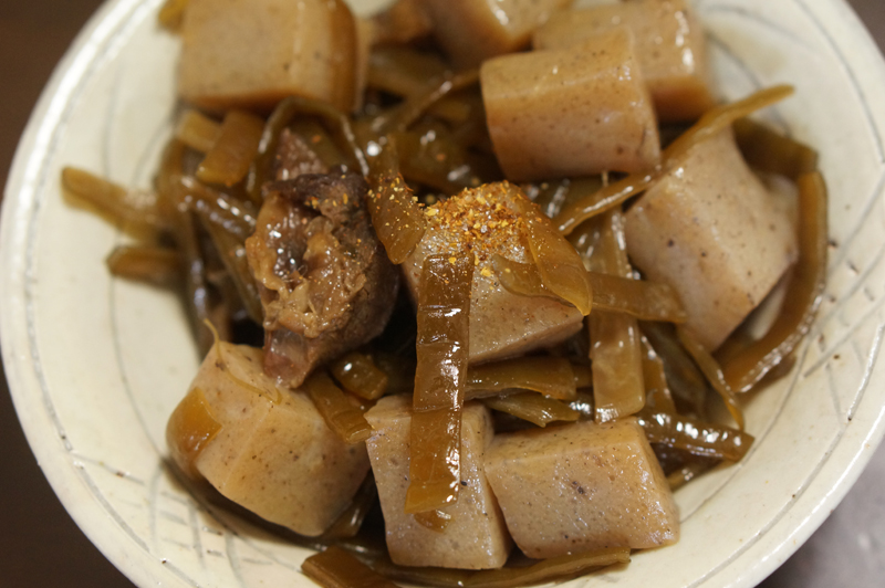 塩抜きした茎わかめ、牛スジ、こんにゃくをしょう油、酒、みりんなどで甘辛く煮詰めました。茎わかめとこんにゃくに牛スジから出たうま味が絡みます。一味とうがらしを一降りするとピリッとしていいですね。ご飯やお酒がすすみます。