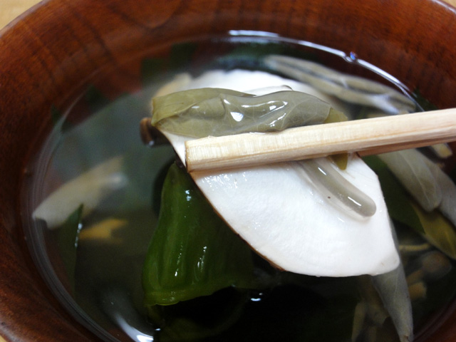 鳴門わかめと松茸でお吸い物、出汁が効いて優しい味わい。贅沢です~。