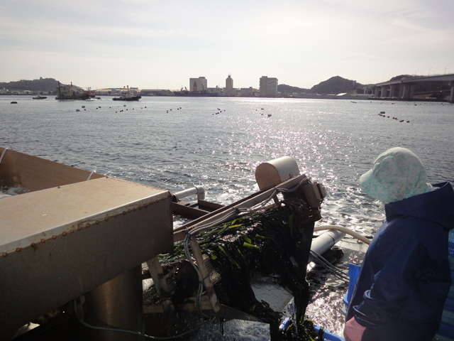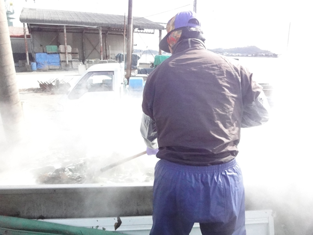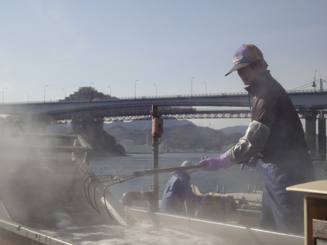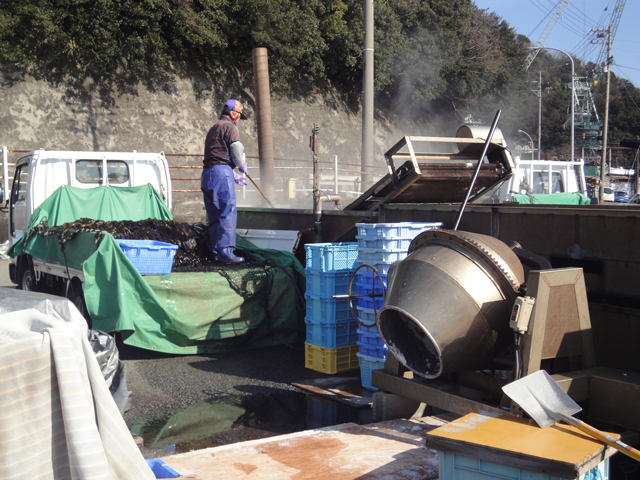 鳴門新わかめの湯通し作業の様子です。2月中旬~4月下旬頃まで、沖が荒れたり、天気が悪くなければ、ほぼ毎日続く作業です。この時期に1年分の鳴門わかめ全量を収穫することになり、収穫と合わせて大変重要な作業となります。
