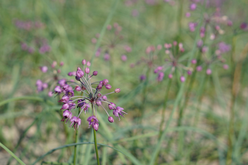 自宅前の畑でらっきょうの花が綺麗に咲いていました。淡い赤紫のような品のある花を咲かせています。蝶々もひらりと舞って楽しんでいるようでした。