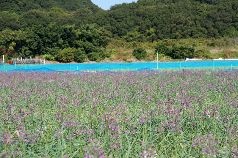 「らっきょうの花が辺り一面です」