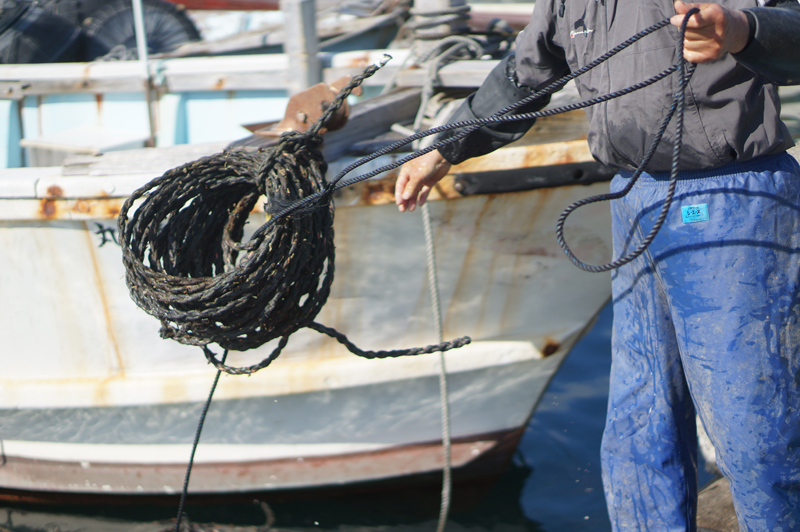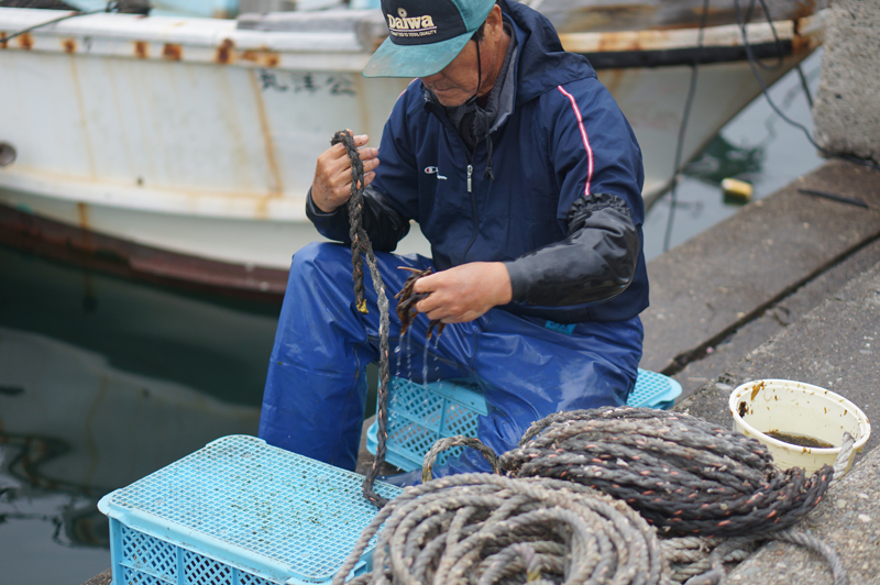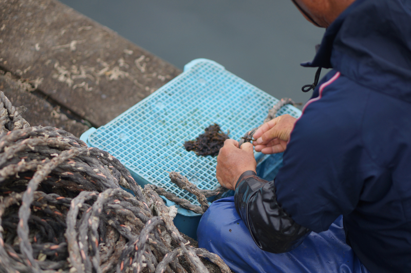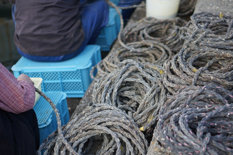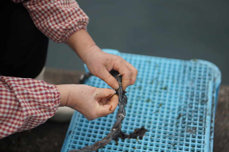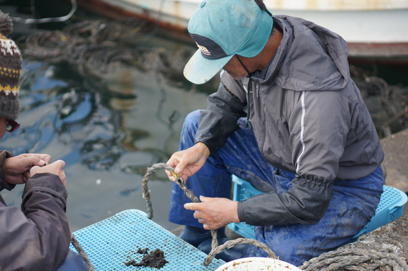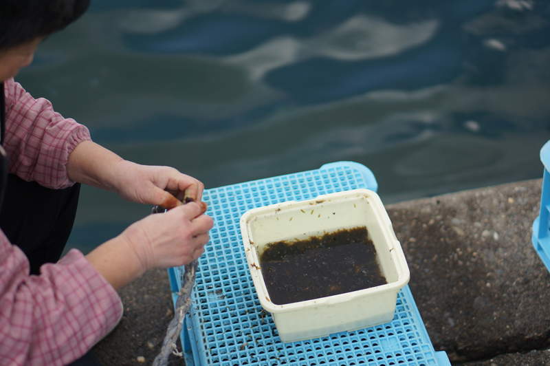 鳴門わかめの種付けが始まりました。写真はわかめの種を綱に差し込んでいる所です。午後からこの綱を沖に持って行きます。