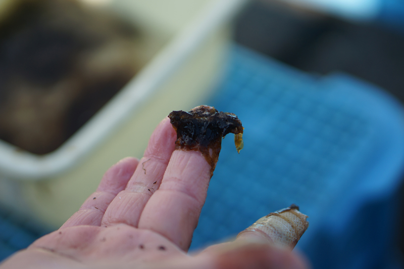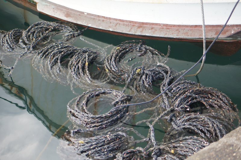 今日もわかめの種付け作業です。今現在は大体全体の半分が終わった所です。今朝は雲行きが怪しくこれから雨が降りそうです。付け終わるまでもう少しかかるかなといった感じです。