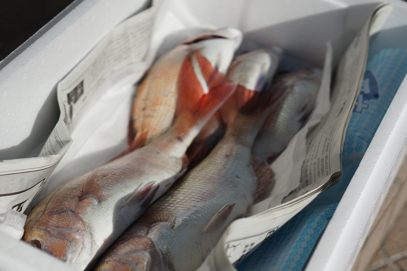 今日の釣果は鳴門鯛が主に釣れました。30~60cmの良型がメインでした。漁から戻ってすぐに出荷作業です。皆さんに喜んで頂ければと願うばかりです。