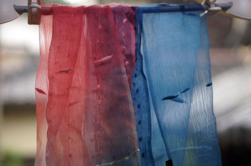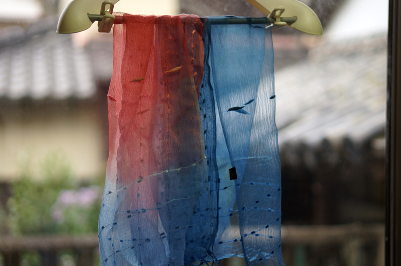 さて帰宅後、早速母にスカーフを渡しました。とても綺麗で自然な色合い。藍色から紅色にグラデーションがかかり凄い品を感じます。素材もシルクで肌触りも気持ちいいです。母親がかなり気に入っていました。