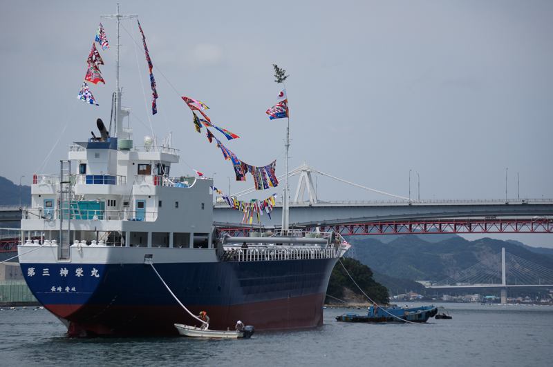 近所の造船所で新造船の進水式がありました。餅投げもあるのですが、毎回どこからともなく情報を聞きつけて餅を取りに来る人が集まります。式自体は華やかで賑やかになるのであの雰囲気は私も好きではあります。新しい船はそれにしても綺麗だなぁ。