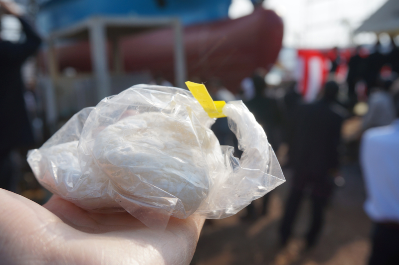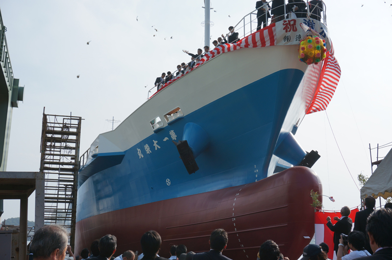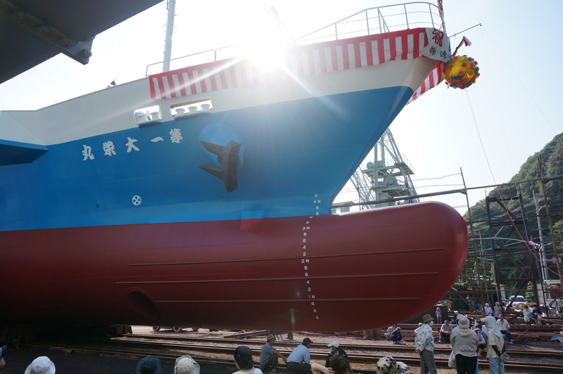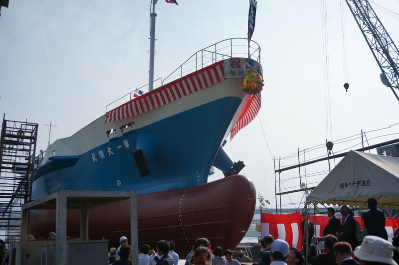 近所の造船所で進水式と餅投げがあるので写真を撮りに行きました。皆さん餅が目当てで袋持参でした。私は袋を持って行ってませんけど、足元に餅が転げて来たので1個ゲットしました。何だか得した気分。中には袋いっぱいに詰めている強者もいました。
