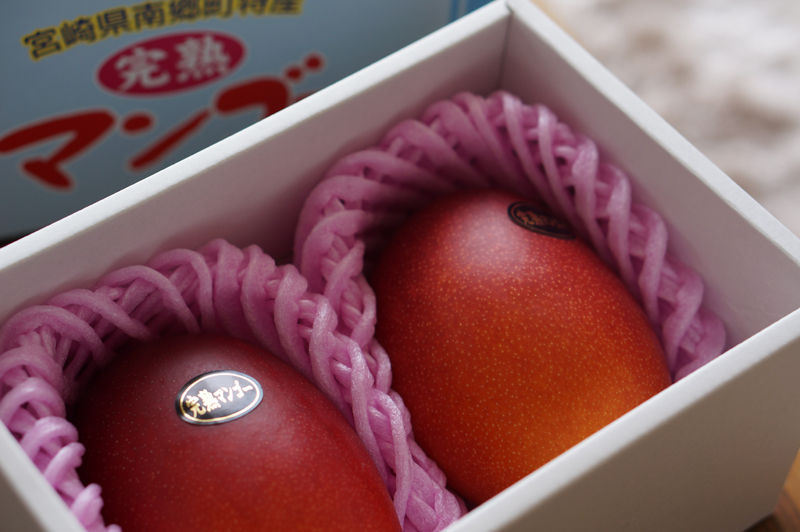 宮崎県産の完熟マンゴーをいただきました!箱を開けると濃厚なあまーい香りが辺りに広がります。艶々で大きな茜色の卵みたいです。