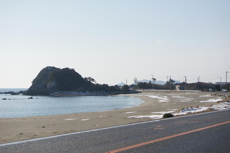 雪に慣れていない地域のため、ある程度溶けるまで待ってから外に出ました。自宅前の千鳥ヶ浜にはまだ雪が残っていました。朝なら真っ白だったでしょう。